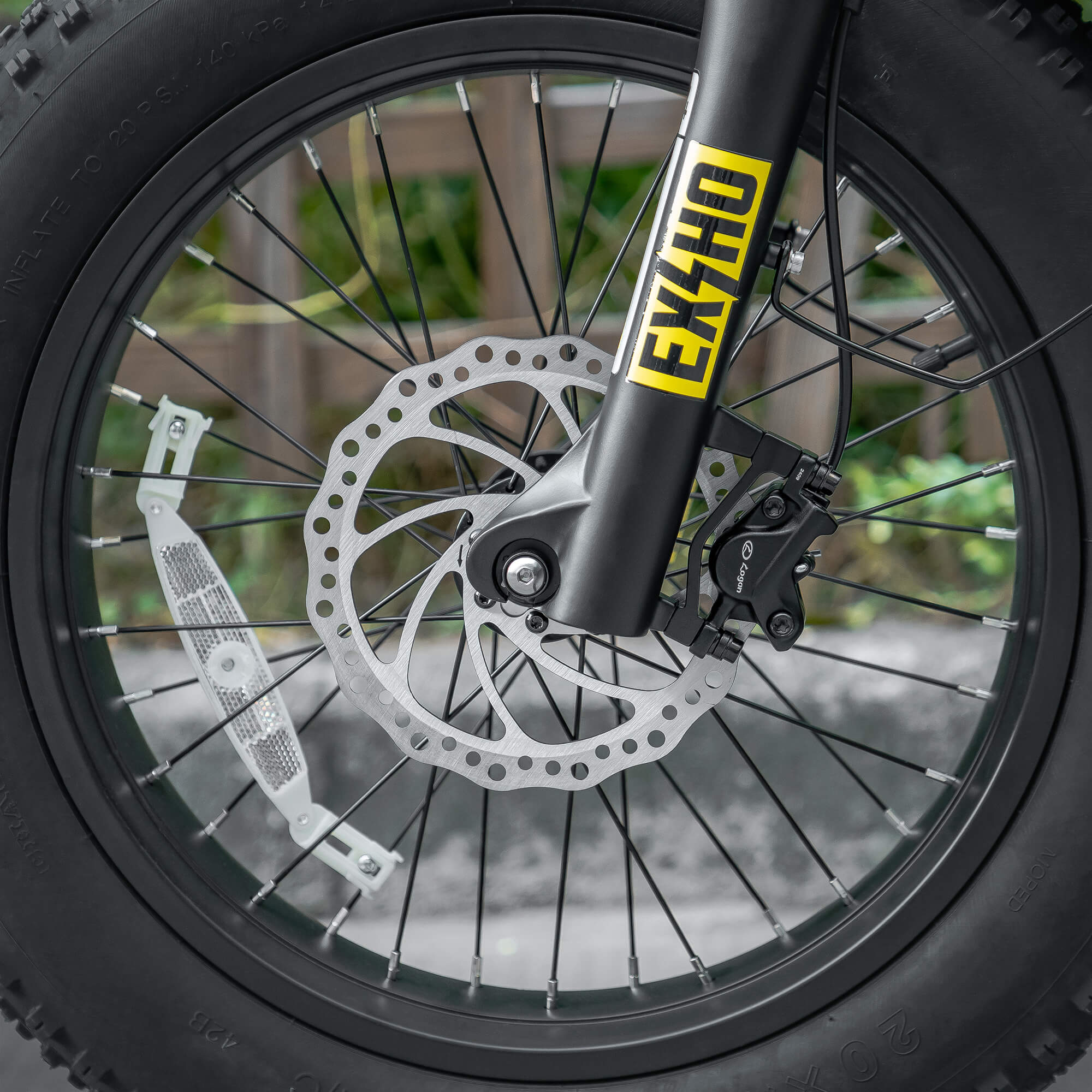 Attraversa qualsiasi superficie con i pneumatici chaoyang 20" * 4.0" e la sospensione. Pioggia o neve, non temere. La bici è impermeabile IPX5 (alcune parti impermeabili IPX7).